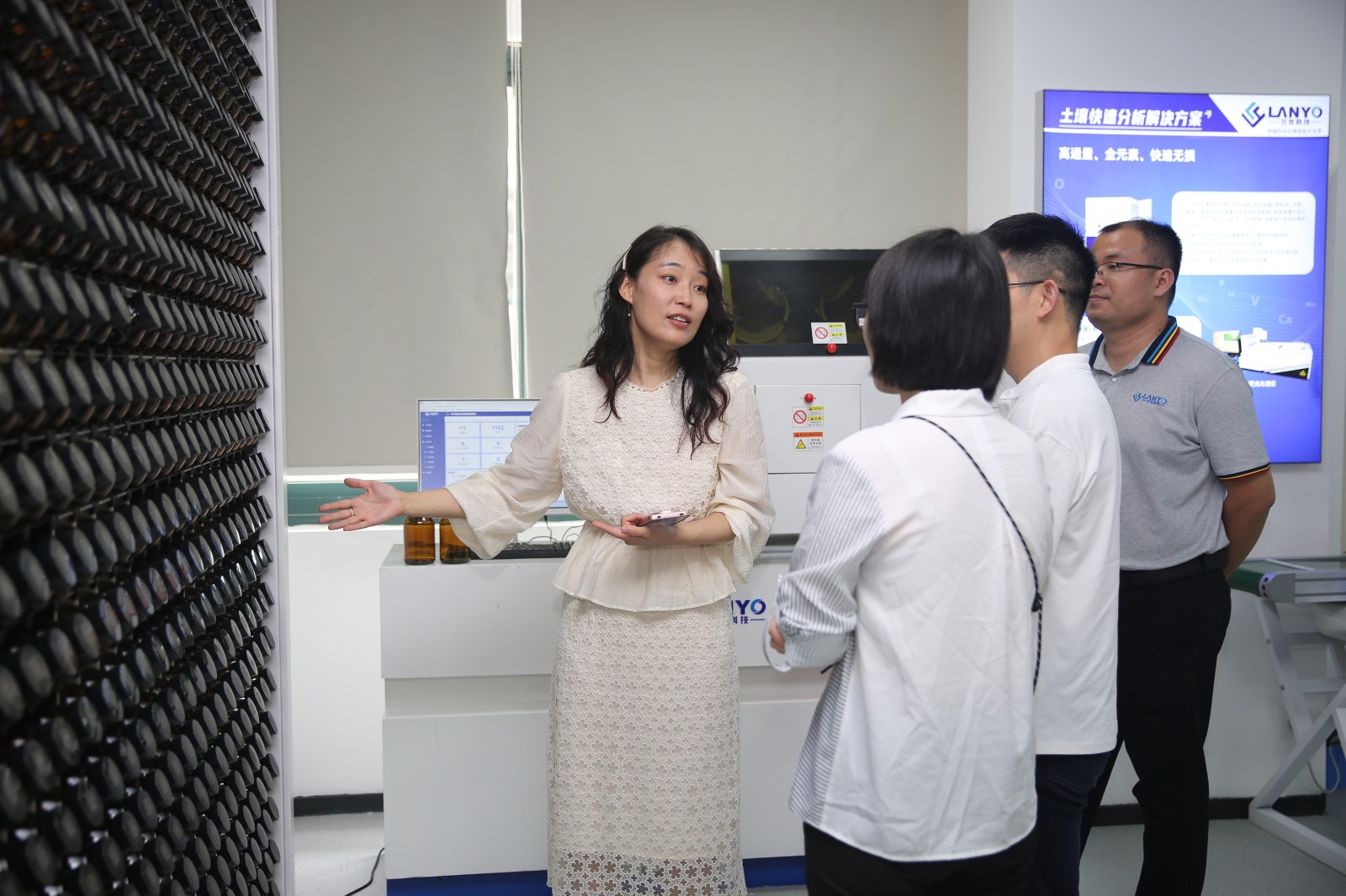 座談結(jié)束后,專家團(tuán)移步至蘭友科技全自動(dòng)土壤生態(tài)環(huán)境監(jiān)測(cè)“制-測(cè)-存”一體化智能化實(shí)驗(yàn)示范中心,近距離感受智能技術(shù)在土壤生態(tài)環(huán)境監(jiān)測(cè)領(lǐng)域的實(shí)際應(yīng)用。蘭友科技的工作人員為到訪的專家們?cè)敿?xì)介紹每款產(chǎn)品的技術(shù)原理、功能特點(diǎn)及場(chǎng)景應(yīng)用,引發(fā)了專家們的濃厚興趣與熱烈討論。