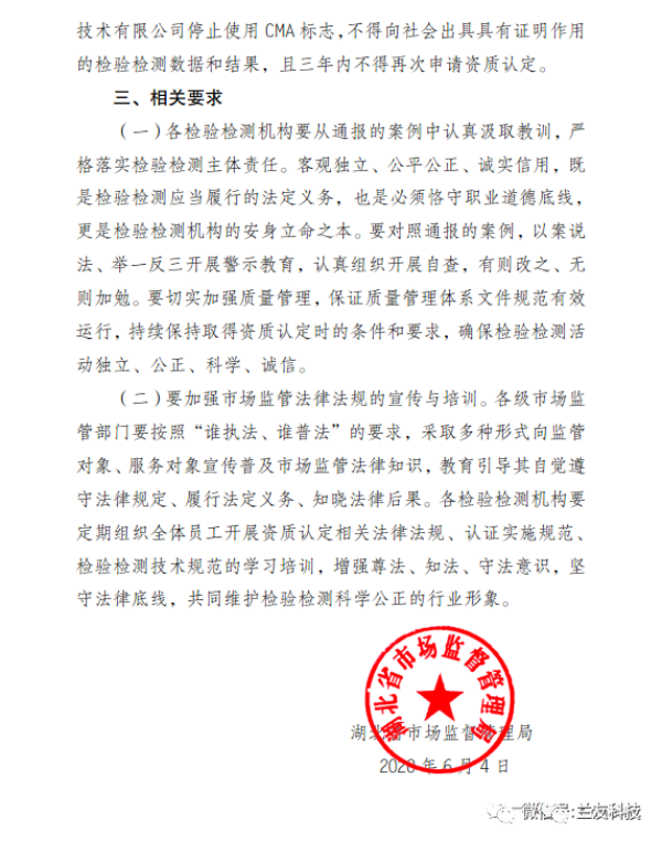 當(dāng)?shù)厥袌霰O(jiān)督管理局發(fā)布通報:即日起,該檢測機(jī)構(gòu)停止使用CMA標(biāo)志,不得向社會出具具有證明作用的檢驗檢測數(shù)據(jù)和結(jié)果,且三年內(nèi)不得再次申請資質(zhì)認(rèn)定。