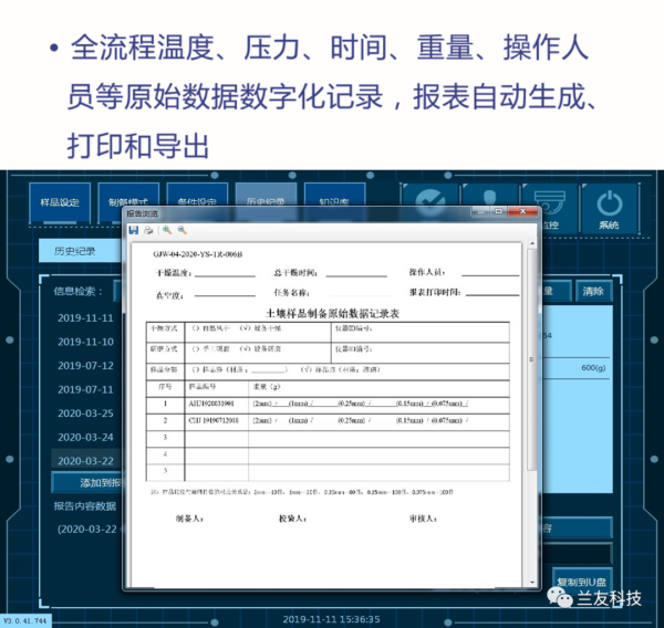 在土壤環(huán)境監(jiān)測全流程中,采樣、分析流程均有較成熟的質(zhì)控方法和體系,但是土壤樣品制備卻是質(zhì)量監(jiān)管薄弱環(huán)節(jié)。傳統(tǒng)手工方法制備過程中,所有原始數(shù)據(jù)均為手工記錄,并且常常出現(xiàn)數(shù)據(jù)記錄不完全,原始數(shù)據(jù)不可追溯等問題。蘭友科技具有自主知識產(chǎn)權(quán)的FASP系列全自動土壤樣品制備系統(tǒng),在掃碼、干燥、粗磨、精磨、混勻、篩分、稱量、四分分樣、裝樣、清潔等10余個步驟實現(xiàn)自動化操作的同時,最重要的是可對全流程的溫度、濕度、壓力、重量、時間、操作人等實驗條件進(jìn)行數(shù)字化記錄,結(jié)合視頻監(jiān)控,所有原始數(shù)據(jù)全流程可追溯,報表自動生成,避免人工造假和篡改。系統(tǒng)集成的質(zhì)量控制模塊,可以為土壤樣品制備提供科學(xué)的質(zhì)量控制方法,幫助用戶達(dá)到標(biāo)準(zhǔn)和規(guī)范的要求。